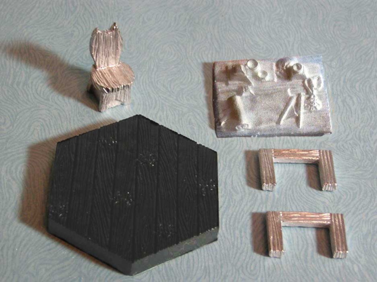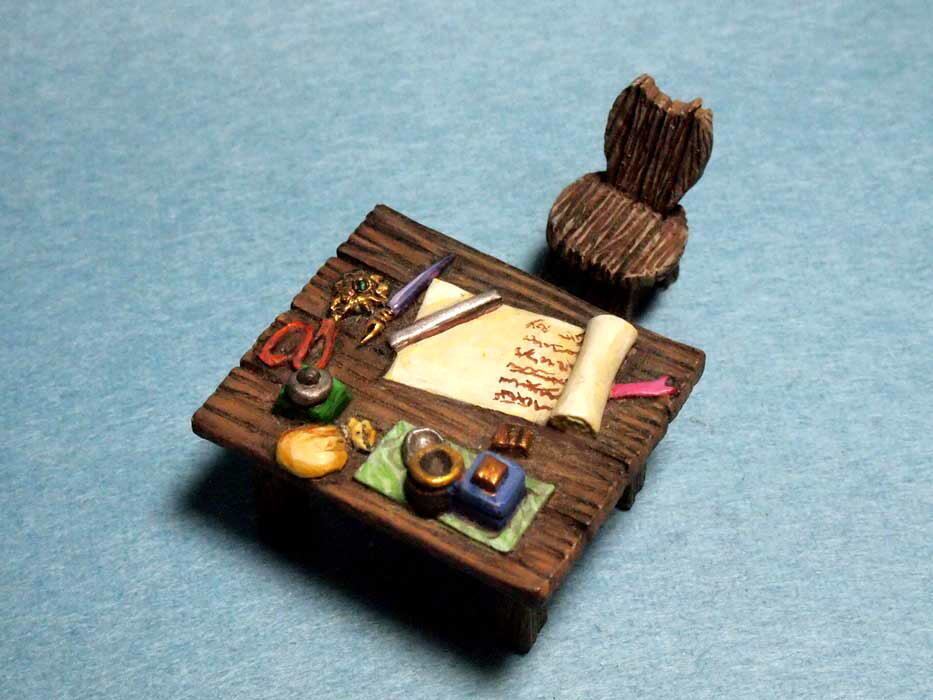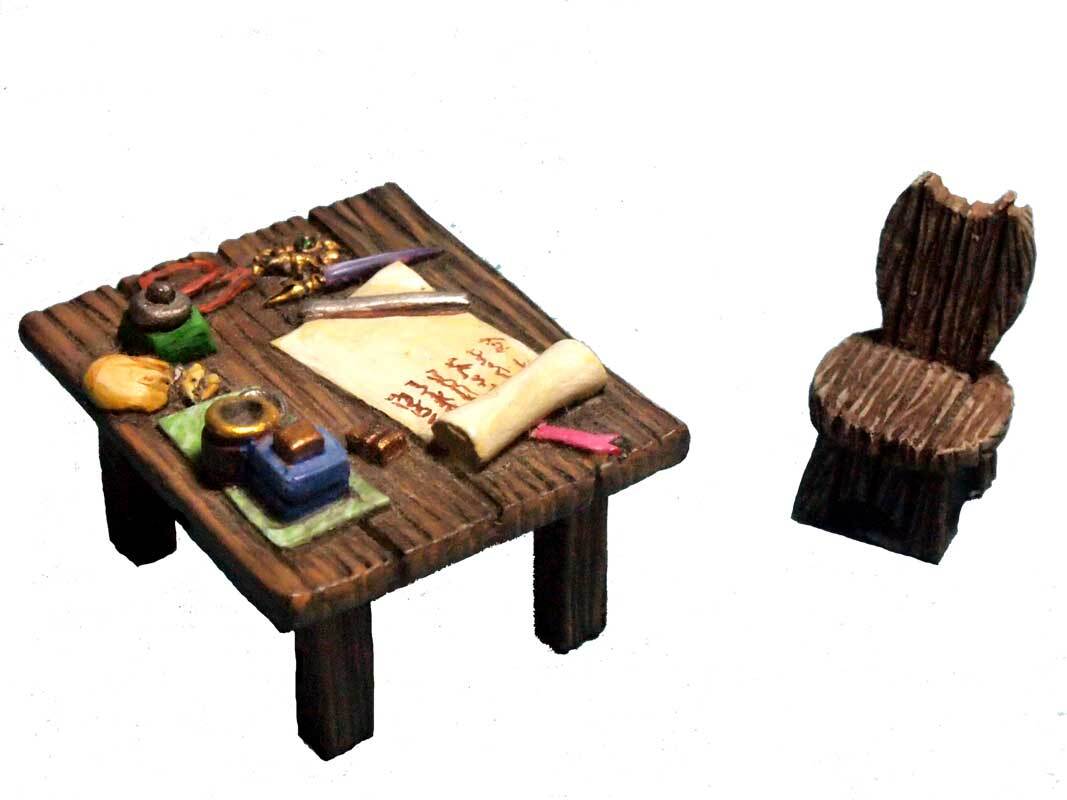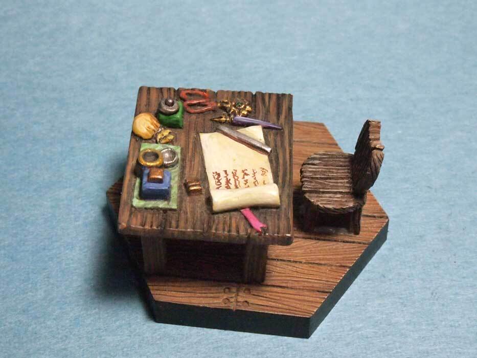 巻物やペン、インク壷などが置かれた書机。ウッドフロアの床のベースが付いています。ホワイトメタル製/ベース:ABS製・サイズ : 机天板23mm×28mm×机高さ14mm・5パーツ