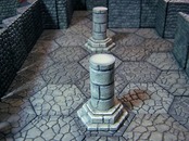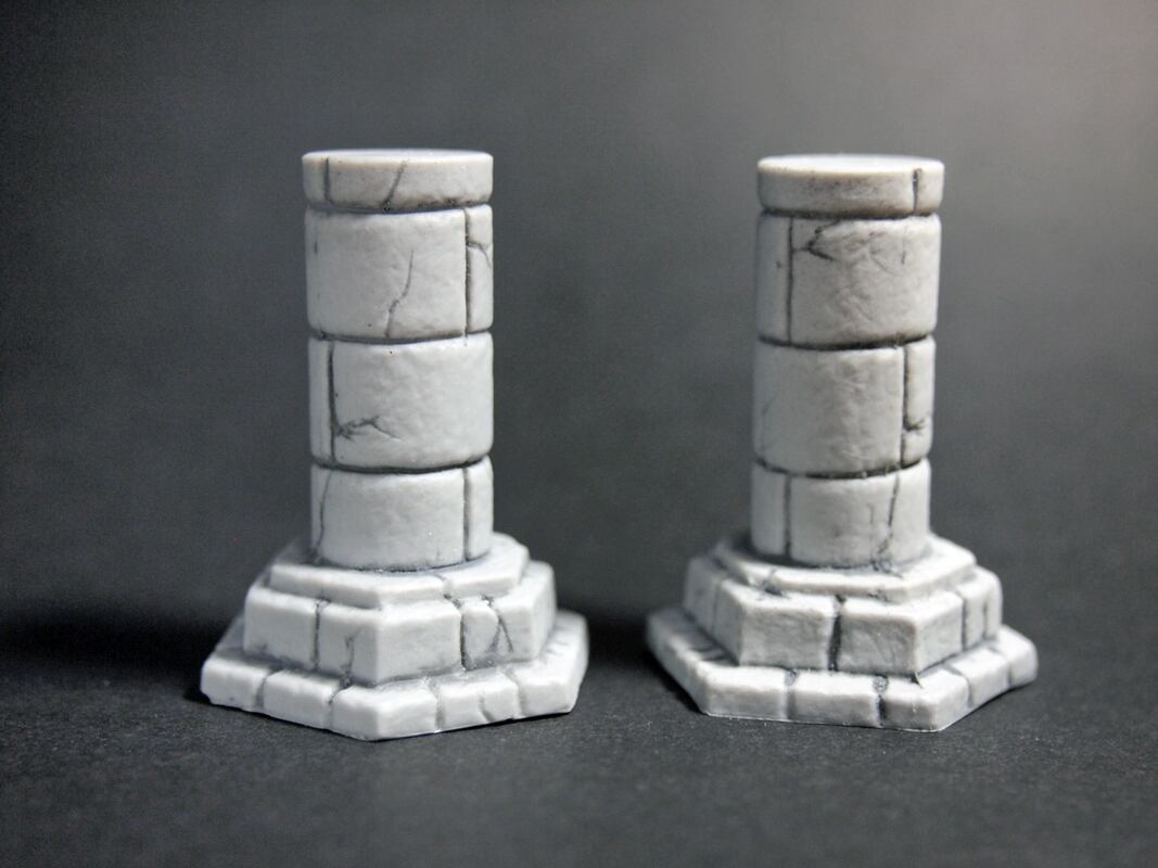 どっしりとした石造りの柱の2個セットです。ヘキサシステムに組み合わせて使用できるサイズ。軽くウォッシングをしてあります。塗装済なためそのままゲームの障害物として使用できます。レジン製・台座対辺幅29mm・全高43mmガレージキットのため、多少の気泡がございますのでご了承下さい。