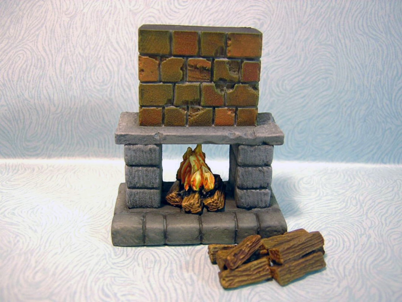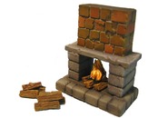 暖炉と焚き火1個、薪の束2種のセット。ヘキサシステムに組み入れて使用できるスケールです。38mm×20mm×高さは42mmほど。ホワイトメタル製・全4パーツ