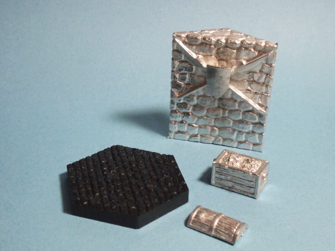 ホワイトメタル製の壁と宝箱、レンガのフロアタイルのベースのセット。ヘクスAとしてヘキサシステムに組み入れて使用できます。宝箱の蓋は別パーツで外れるようになっています。43mm・全高48mm(ベース含む)・全4パーツ