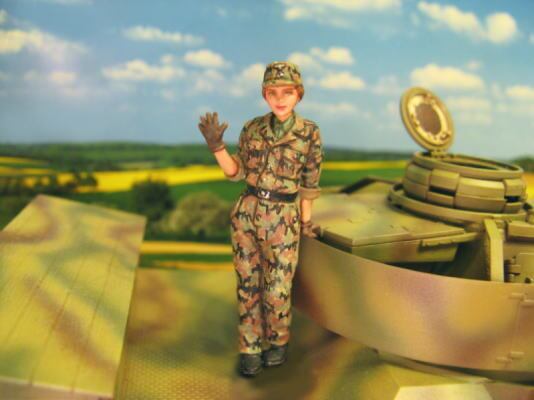 第二次世界大戦時のドイツ軍SSタイプの戦車兵つなぎ服を着た女性兵士。帽子はカモフラージュキャップ、キューポラに片手を付いて手を振っているポーズ。当時ドイツ軍に女性の戦車兵は存在しませんでしたが、戦争が長引いていたらもしかして・・・という設定