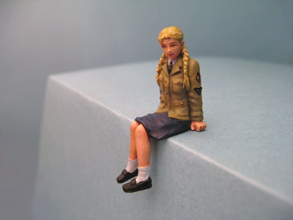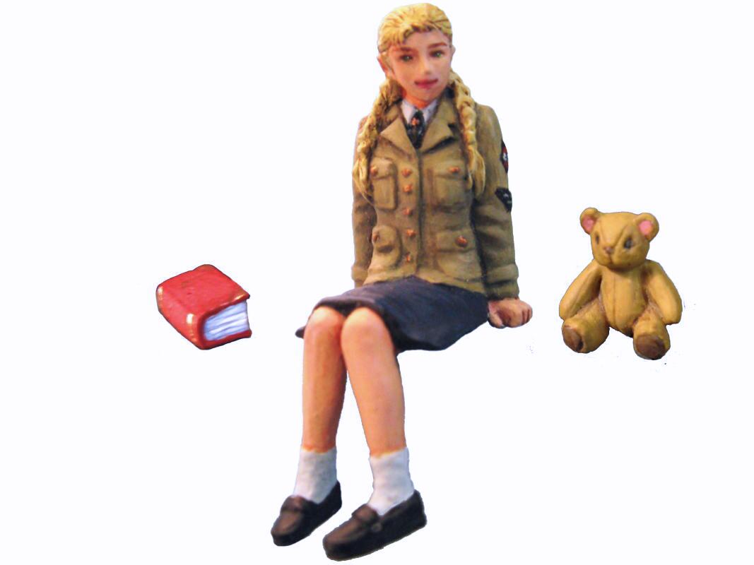 ドイツ少女同盟の女の子が座席に座っているポーズ。ティディベアと本が付いています。