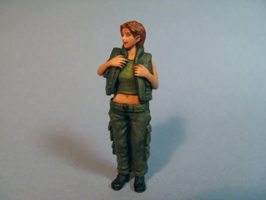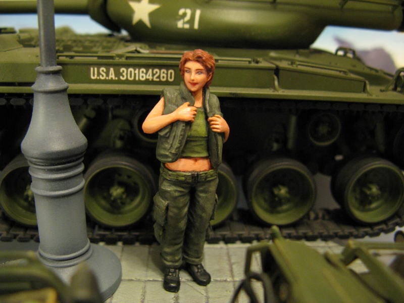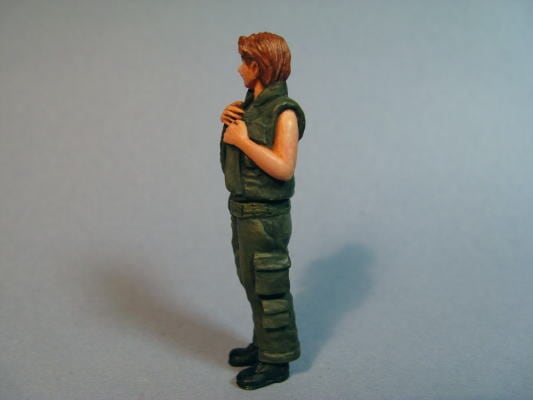 ボディアーマーを着ている女性兵士。モデルはベトナム戦争時のアメリカ軍の兵士です。現用戦車のジオラマやガンプラのジオラマなどにも合わせられる、汎用性の高いミリタリーフィギュアです。
