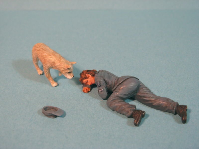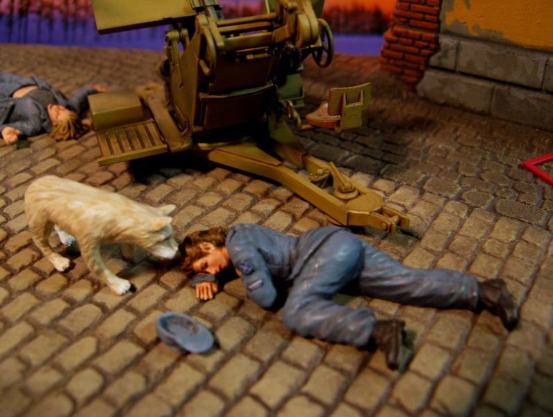 第二次世界大戦時のドイツ空軍高射砲補助婦。倒れているフィギュアと帽子、犬のセットです。1/35スケール・フィギュア全長48mm・犬16mm×30mm・ホワイトメタル製・6パーツ