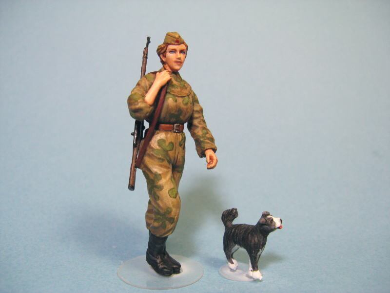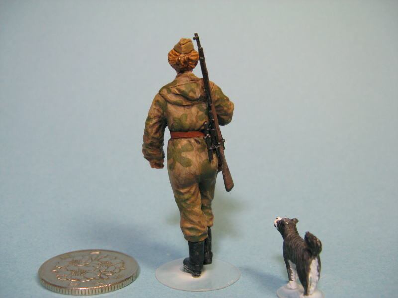 第二次世界大戦時のロシア女性スナイパーと犬・銃のセット。1/35スケール・全高52.5mm・ホワイトメタル製・4パーツ
