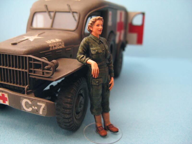 右腕を後ろにもたれさせ寄りかかっているポーズのアメリカ軍看護婦。軍服は1950年頃のバージョン。朝鮮戦争当時の写真をモデルに造ったものです。1/35スケール・全高53mm・ホワイトメタル製・2パーツ