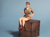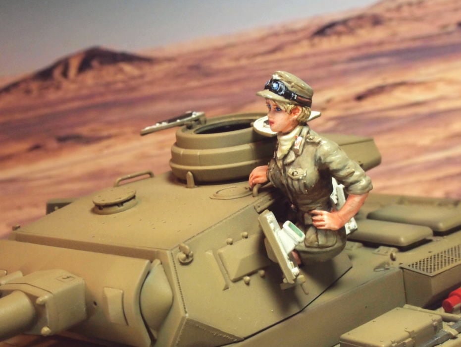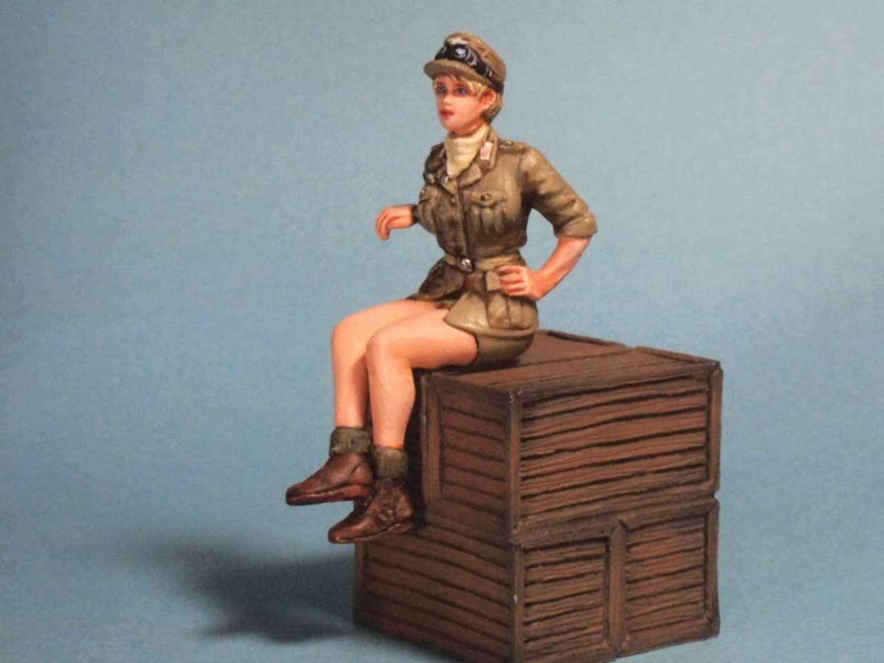 戦争が長引いていたらもしかして・・・という設定。実在はしていないドイツアフリカ軍団の女性戦車兵です。DAKのパンツァージャケットをスカートにアレンジしてフィギュア化。戦車の14×10mm程度のハッチから身を乗り出せる仕様です。