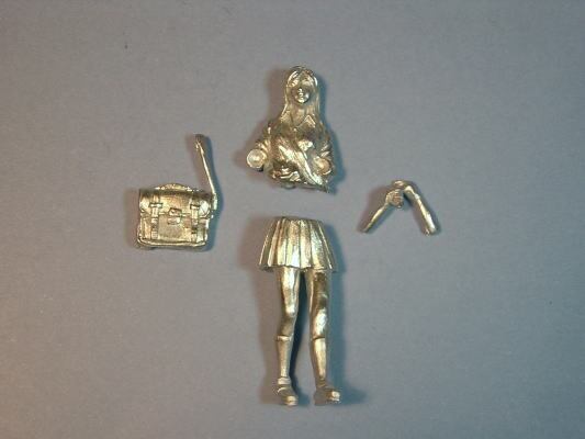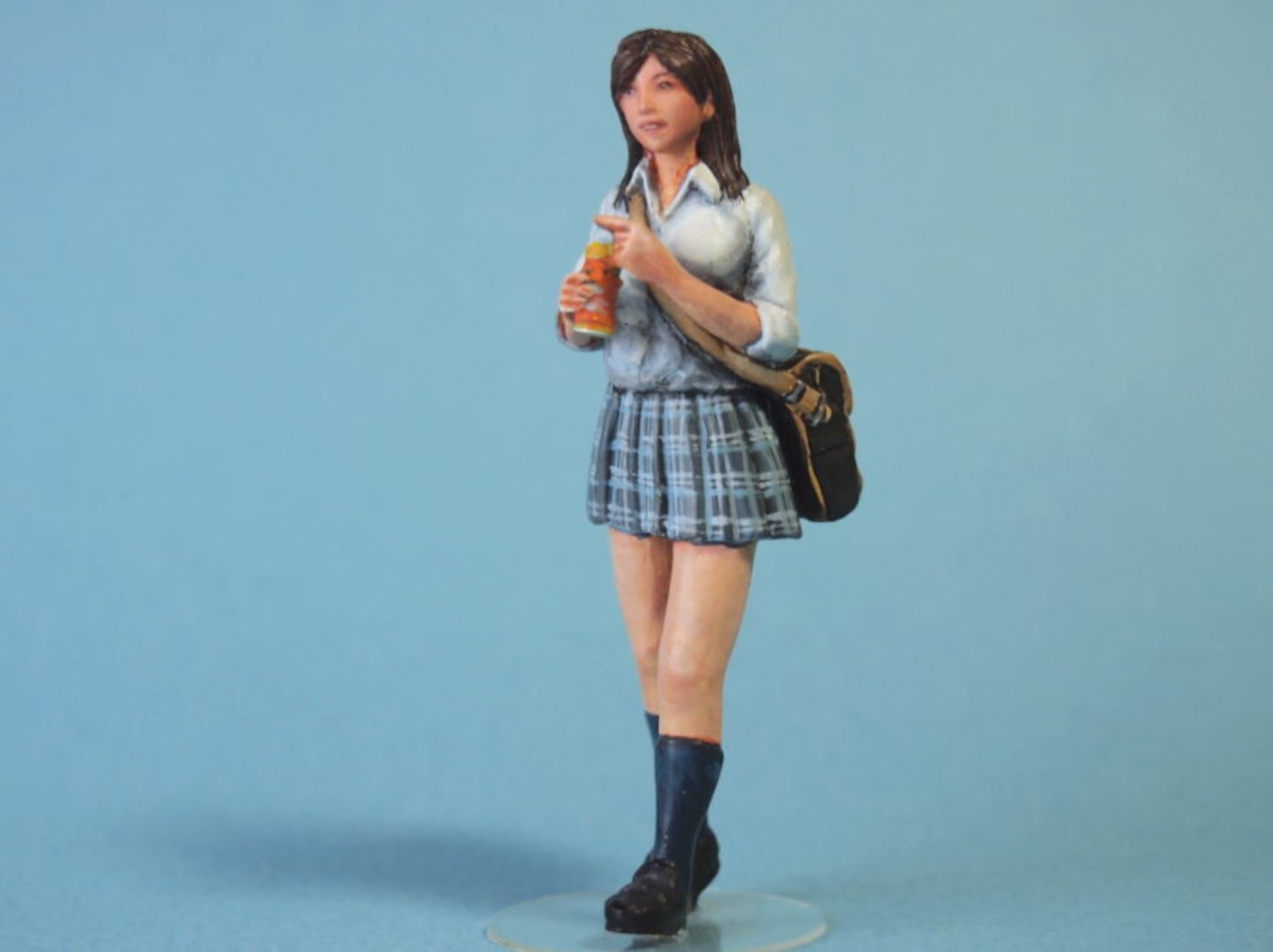 ペットボトルを持ち、スカートを折り返して短くしている女子高生のメタルフィギュアです。全高50.5mm(1/32スケール)・ホワイトメタル製・4パーツ
