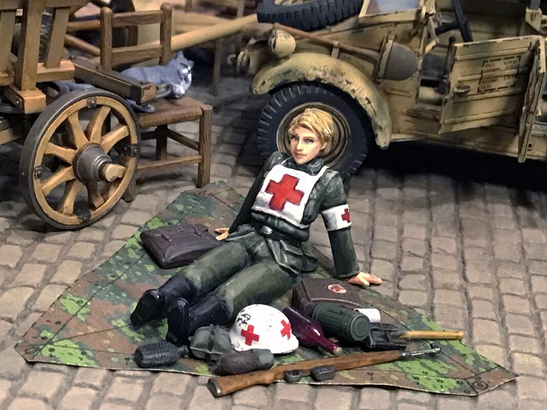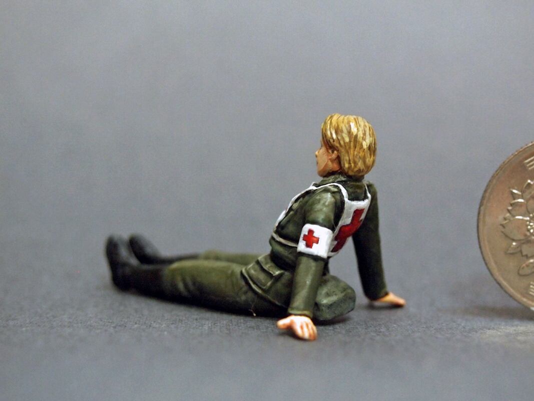 戦争が長引いていたらもしかして・・・という設定。実在はしていないドイツ軍の衛生兵です。1/35スケール・フィギュア全高25mm・ホワイトメタル製・2パーツ